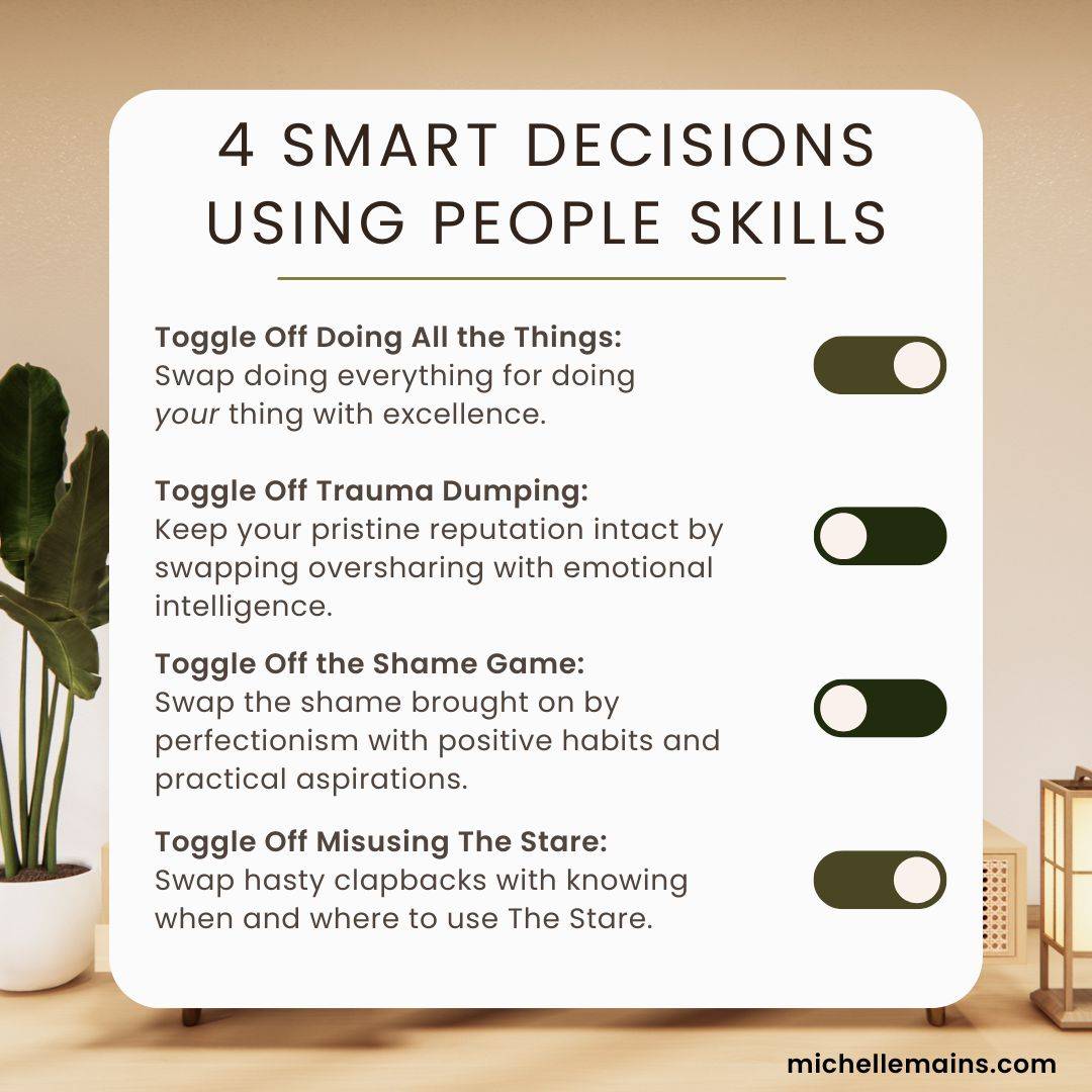 Hey Reader - A friend is getting serious about his girlfriend, so you can imagine how nervous he was to travel to Texas to meet her family. He told me, "I was on my company manners, but the judging was endless. I got the silent side-eye at every meal." "Well, mother-in-law relationships can be tough," I said, trying to console him. "Mother-in-law? I was talking about my girlfriend's brother, who's home from college!" Ahh, my friend was on the receiving end of the controversial Gen Z stare. How The Stare Can BackfireSome people argue that The Stare is an act of agency, with a spectrum ranging from protecting emotional overload to refusing to engage in annoying conversations. But here's what the funny TikToks forget to mention: The shutdown you think you're dishing out could come with a harsh tax. For instance, here are emotional intelligence misfires at work you may have noticed: · People might think someone can't keep pace, giving rise to a "doesn't fit in" narrative; · People see a lack of response as disrespectful or belittling someone else's input; and · People are overlooked for critical client interactions, getting frozen out of client dinners or A-list social events. However, you have a new communication tool by utilizing people skills like managing your emotions and applying your lived experience. So, regardless of your generation, use The Stare when: 1. You need to buy time. "You've given me a lot to think about" is a common negotiator response. 2. You're unsure how to respond to a questionable comment. Avoid the temptation to fill uncomfortable space. Your blunt, rambling reply may wind up being the story. 3. You're in the middle of a conversation not worth having. As Mark Twain wrote, "Do not argue with a fool. They will bring you down to their level and beat you with experience." 😉 Social pressure to be polite at work isn't new. So, toggle off hasty choices and toggle on to knowing when and where to use The Stare: Series RecapIn the July series, Toggle Off/Toggle On with People Skills, we've discussed how people skills can help you say no to everyday pressures and yes to better choices. The toggle exercise can sound flip, but it's a fast way to stack rank your investments. So, imagine a dashboard. Where are you ready to invest more deeply and push the slider up? And where do you want to toggle off altogether? Here's a recap of what we've learned: The midpoint of the year is the perfect time for a refresh. So, act like the creative, wise CEO of your life—a Soul Boss—and use people competencies to take charge of your choices. I'm taking the month of August off to recharge. Follow me on social media for self-care inspiration. Have a great end of summer, and I'll see you in September! 🏖️ All the best, Michelle Mains Keep the Soul Boss inspiration going!