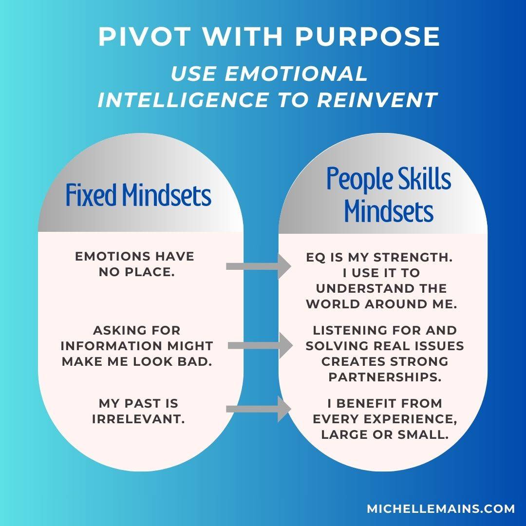 ​ Hey Reader - Are you someone who has a mixed bag of professional experiences? You may be more equipped to pivot than you think—that's what happened for Joanna Patchett. Joanna dreamed of spending her life as an actress. However, after completing a double major in English and Drama, she wound up spending the next decade trying to find the right path. On the one hand, she was steadily employed. Still, jobs such as teaching English, being a dental assistant, or leading yoga classes felt like a professional dead end. She decided to shake things up by enrolling in an accelerated one-year nursing program. Shortly after graduation, COVID hit. Despite the long days, the emotional bonds with her patients and coworkers led her to fall in love with nursing. Now she's transitioned into a career as a hospice nurse case manager. Do you want to hear what sets Joanna apart? Her diverse lived experience. It turns out that the jobs that seemed small at the time added up to something significant. ​She remarked, "When it comes to changing your life, you sometimes have to decide to change. Once you do, almost anything is possible. Everything you do contributes to who you are now. Ironically, my yoga, acting, and teaching training gave me the ability to stay grounded, present, and in the moment. Not one part of your journey, even if you're not sure what you're doing, or where it's going to lead you, is ever wasted. You're never late. You've simply not arrived yet." Make Emotional Intelligence Your Secret WeaponIn the September series, Pivot with Purpose, we're discussing how you can take charge of your next chapter by using your favorite people skills. You might be thinking, Wait a minute—I'm a Type A, GSD kind of person. If "purpose" means being a compassionate softie, count me out! If you're skeptical that you can simultaneously stand on business and practice emotional intelligence, then take a walk down memory lane. Remember the colleague who shared the load when a deadline was looming? Someone who really listened to your feedback? Or the manager who cut you slack when you went through a rough time? These examples demonstrate why understanding what matters to people isn't performative. It's an essential, marketable skill. Likewise, you can bring your purpose to life by combining critical thinking and EQ. Here are three mindset swaps to get you started: It's simple: Having purpose translates to having impact. So, kickstart your pivot by building your purpose on compassion and connecting. All the best, Michelle Mains ​ Keep the Soul Boss inspiration going!