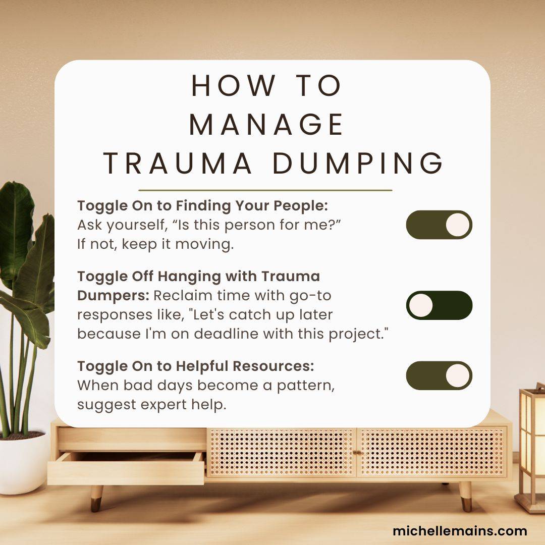 Hey Reader - Recently I saw a video about office disagreements, and the narrator recommended having side meetings with each participant. I thought, Good grief—roaming from person to person, replaying the incident? That's not going to do your reputation any favors! Have you known someone who loves to share, share again, and overshare? Yes—you're in the company of a Trauma Dumper. That's the nickname making the rounds for people who communicate too much at the wrong time and with the wrong people. Raise Emotional Intelligence to an Art FormThe TikTok from briellebelly123 is a classic example of accidental trauma dumping. If you didn't see it, Brielle had aspired to work in New York City. What she hadn't aspired to do was commute an hour or more each day after sitting at a desk from 9 to 5. The more she realized work/life balance was a stretch, the more upset she became. And that's when the tears started. It didn't take long for the video to go viral. Many people could relate to feeling overwhelmed, but the prevailing sentiment was that Brielle was either entitled, unrealistic, or a snowflake. Within two months, her startup laid her off, claiming that they didn't have the bandwidth to train her or expand her job portfolio. 3 Ways to Handle TMIIn the July series, Toggle Off/Toggle On with People Skills, we're discussing how people skills can help address everyday pressures. What Brielle didn't know was that every feeling has its place—just not in every conversation! So, instead of being bounced around by the mood of the minute, keep your pristine reputation intact with people skills like well-timed decisions and pulling wisdom from your lived experience. Here are three ways to practice: Toggle on to authenticity and integrity, where you know what to say and when to say it. Toggle off oversharing. 💗 All the best, Michelle Mains Keep the Soul Boss inspiration going!