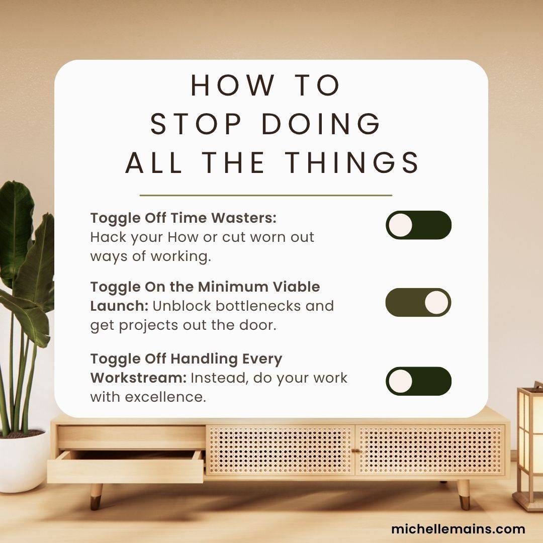 Hey Reader - I ran into a guy I hadn't seen in a while, and he couldn't stop smiling. "My kid graduated and now he's off to Atlanta for his first big job. We're empty nesters at last. Toggle off full time parenting and toggle on the fun!" You may not be free of a major responsibility, but that doesn't mean you shouldn't adopt his mindset. So, in the July series, Toggle On/Toggle Off with People Skills, we'll talk through four common pressures and ways people skills can help you manage those pressures. First, let's talk about overindexing. According to Deloitte's 2024 survey, 40% of Gen Z respondents and 35% of millennials confirmed they feel stressed all or most of the time. However, you don't have to accept exhaustion or letdowns as normal. Instead, see them as a message to shift priorities—that's what luxury brand Coach did. After years of mixed sales, Coach took a time out to identify lagging product lines. Then they used that data to reorganize their priorities. By toggling off trying to do all the things, they toggled on to a financial boom. Play Your Part, Not Every PartThe temptation to overdo was also a problem for my co-worker, Jayne. After two years in an overseas assignment, she was ready to jump in with both feet when she returned to corporate headquarters. Jayne's quality work was a double-edged sword. She was quickly in demand but also swiftly overloaded. Everything came to a halt after a serious ski accident. The forced downtime nursing a broken leg gave her plenty of time to think. When she returned to work, she was ready for a new set of rules. Her bright line was clear and simple: Toggle off trying to play all the parts. Toggle on for doing her part. Jayne told me, "I had a light bulb moment and realized there's a difference between healthy engagement and trying to do anything and everything! Excelling starts with managing my work really well." Use Soft Skills to Toggle On and Toggle OffHave you ever been like the case study, where trying to play all the parts backfired? Disrupt that old way of bossing up by taking a step back. Taking stock may seem counterintuitive, but it works because you're being respectful of other people's skills and contributions. In a sense, knowing what is yours to do is the ultimate version of staying in your lane. You set yourself up for success by being able to articulate your deliverables and how they align with other people's work. Now that you're onboard to toggle off overindexing, the question is how to make it real without seeming self-serving or even tone deaf. Try to make this exercise fun and personal. After all, you're saving your own time and peace of mind, so get creative! Knowing what should receive your full attention requires daily people skills like critical thinking and adaptability. However, working with care and attention pays off with impeccable contributions. People will be able to instantly spot your style and how you've influenced outcomes. So, toggle off trying to do all the things. Toggle on to doing your thing. Really well.⭐ All the best, Michelle Mains Keep the Soul Boss inspiration going!